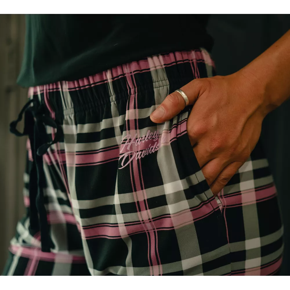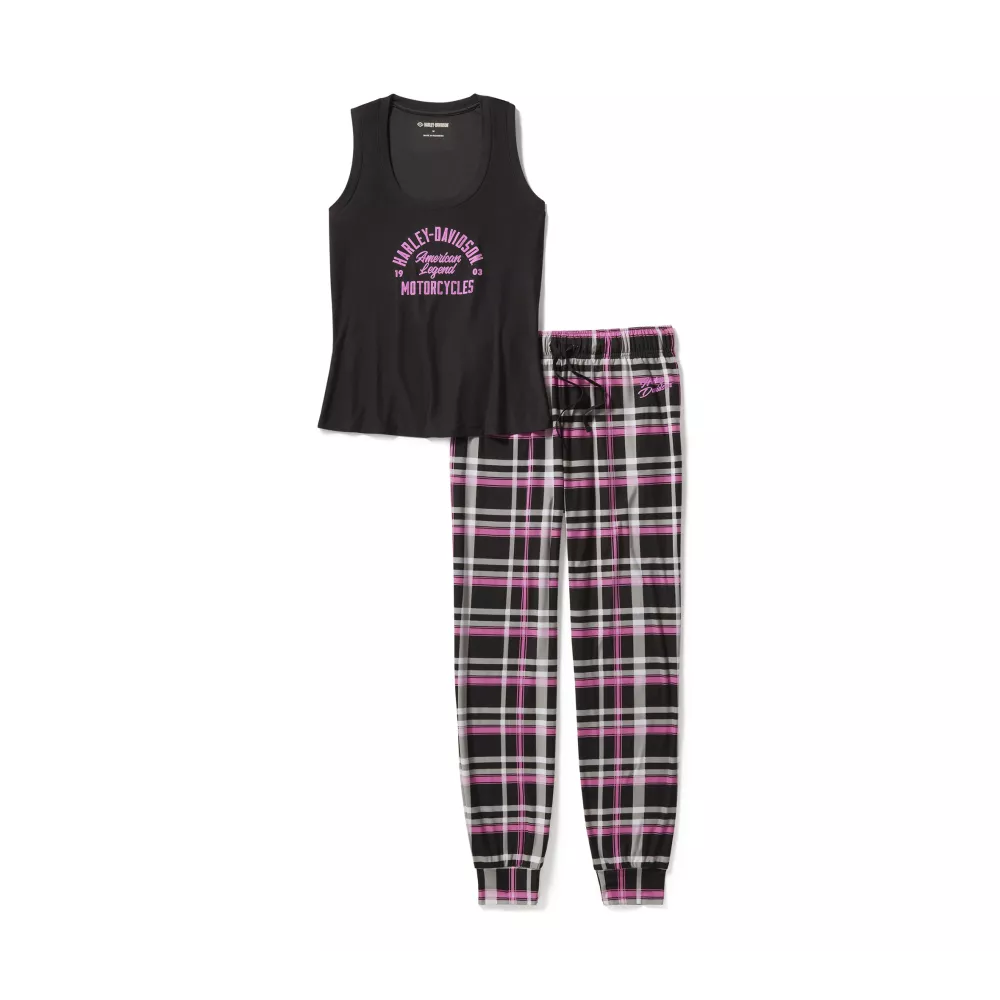 Snooze in H-D style with our Plaid Pajama Pant Set. These women’s pajamas are crafted for coziness from polyester jersey with a hit of spandex for added stretch. The sleeveless top features set-in trim and a flattering neckline. The pants have side seam pockets, a drawstring waistband, and cuffed leg openings. The attractive plaid bottoms complement our 1980s-inspired graphics on the top.